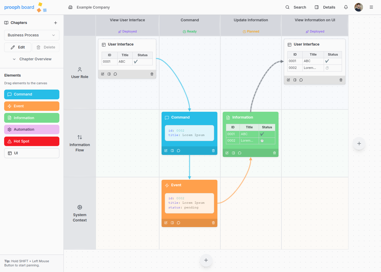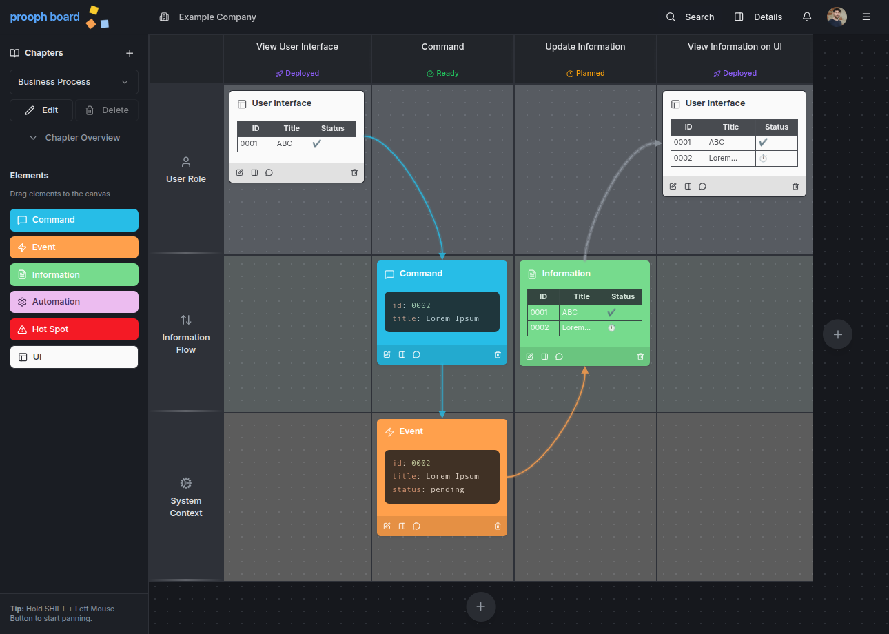 Instead of ticket system micro-management Product Owners and Project Managers want to have the big picture on screen and share the system progress with stakeholders in a second, especially the chapter overview, event timeline and milestones. prooph board offers a control plane for automated Software Development Life Cycles (SDLCs) that works for small and big businesses. Product Owners and Project Managers benefit from status tracking and documentation in one place.